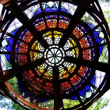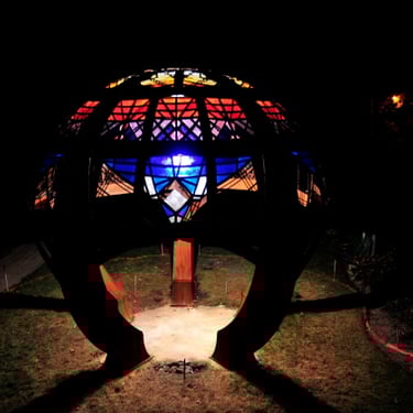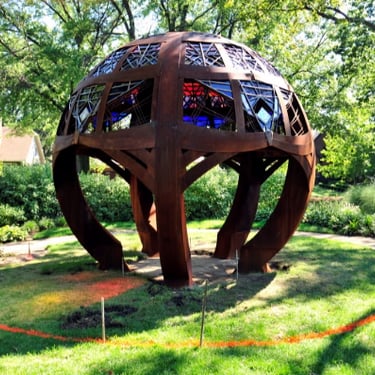 The Rainbow Sphere sculpture is 15 ft. tall and 15 ft. in diameter. It is composed of 5 tons of Cor-Ten steel, copper, and Dalle de Verre stained glass.