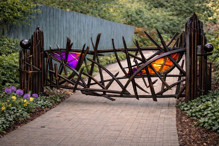 The Venice Gate is composed of forged and fabricated Cor-10 steel, copper, and Dalle De Verre stained glass. 15 ft. wide and 8 ft tall.